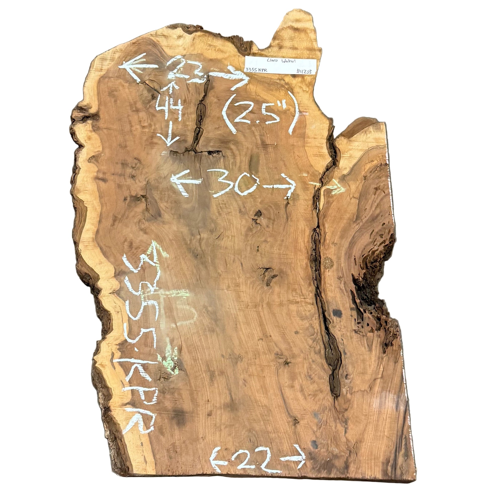 Kiln dried Claro Walnut live edge wood slab measuring 2.5X23-30-22X44.
