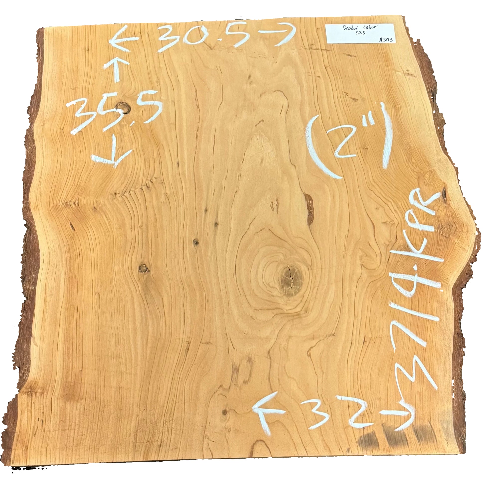 Kiln dried and surfaced Deodar Cedar live edge wood slab measuring 2X30.5-32X35.5.